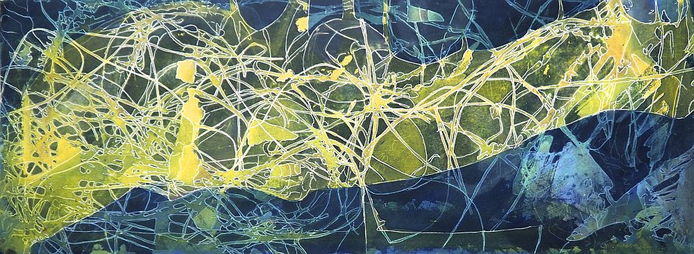 pulsating multiverse #1 worlds without end: pulsating multiverse #1- spring’s blue ribbon, 2019. Cyanotype, ink drawing, water color on BFK paper 27 1/2" x 10 1/2”